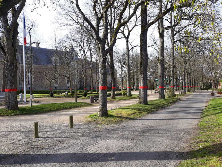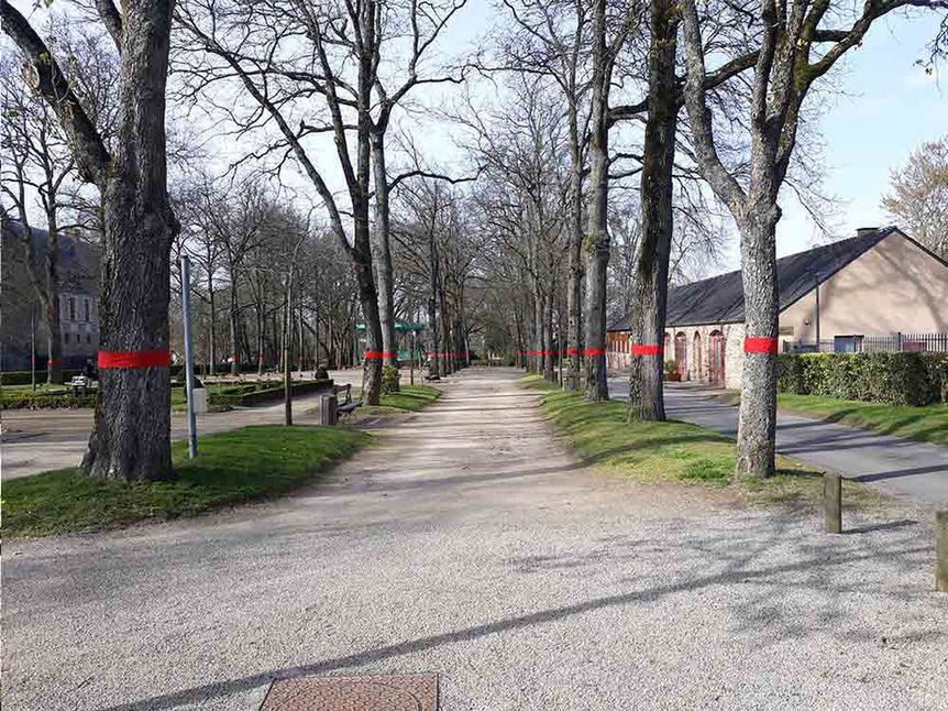 95 arbres entourés d’un ruban rouge d’une largeur de 18 cm, environ 140 mètres linéaires